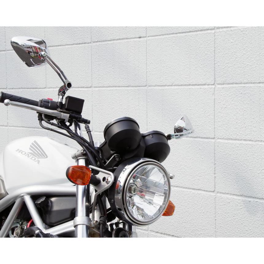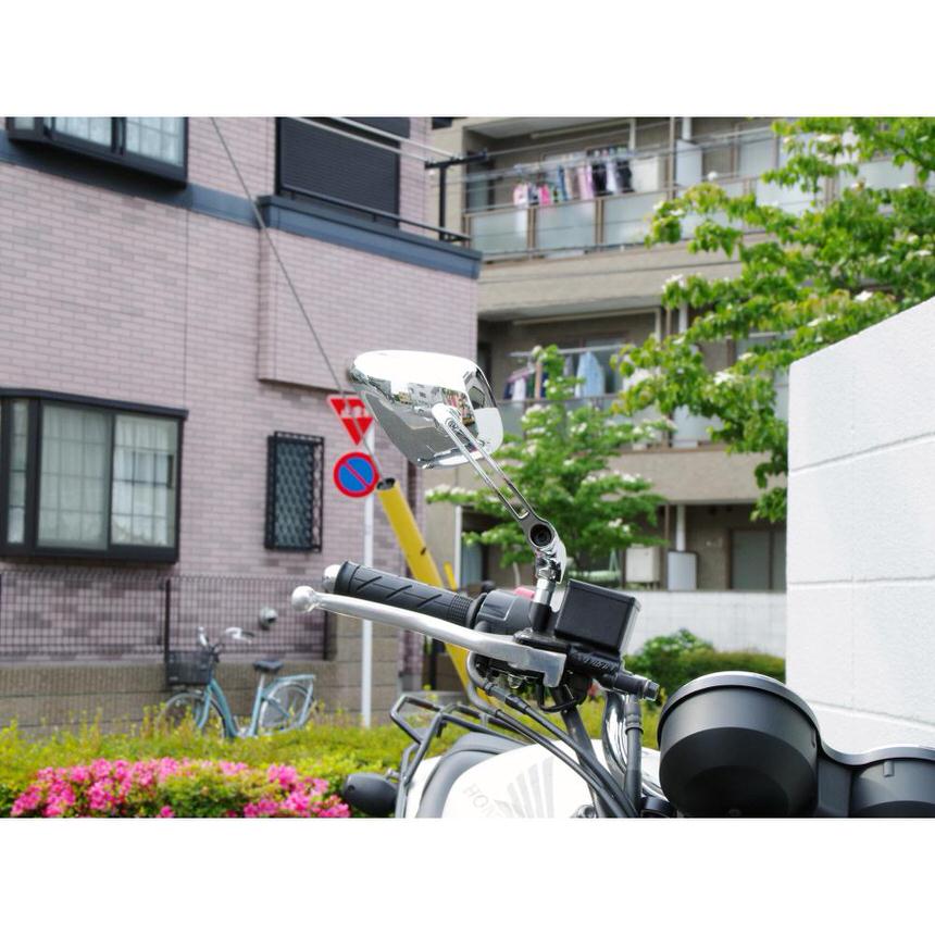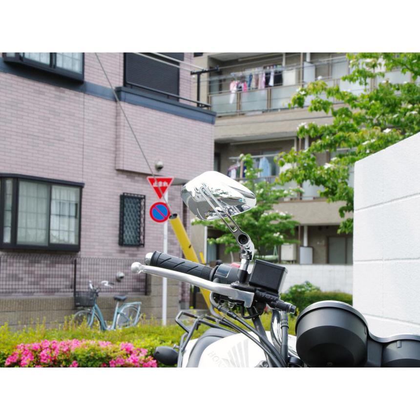 ボディ:アルミカラー:メッキミラーのポジションに正しい位置は存在しません。ある程度調整にセオリーはあっても、好みは人によって千差万別です。シャフトの形状を決めてしまうと、細かい調整が出来なくなってしまう為、シャフト部分の調整機構を取り入れたミラーを開発致しました。シャフトは上下に調整する事が可能です。車種によって、ミラーの基部の高さは異なります。取り付けたミラーの高さによっては、自動車のミラーと同じ高さになってしまい、ミラー同士がぶつかりやすくなってしまうことがあります。しかし、高さの調整をすることで、このような事態を防ぐことが出来ます。また、ミラーは車体を構成するパーツの中でも比較的大きなパーツですので、高さの調整をすることで、車両のイメージが変わります。シャフトの上下の調整は六角レンチ一本で調整が可能です。狭い道を走行中にミラーが邪魔になることがあります。これは後方の視界を見る為に、ミラーがハンドルより横に出ているからです。フリースタイルミラーは、そんな時に鏡面を180度回転させることが出来ます。鏡面の回転させるのに、工具は必要ありません。バイクにまたがったままで調整可能です。鏡面は凸型レンズを採用していますので、より広範囲を見ることが可能です。またレンズの色はブルーレンズを採用。最近は純正でHIDを採用している車も多く、明るくする為にHIDに付け替えているユーザーも多数存在します。後ろを走られると、まぶしくてげん惑現象になり、一瞬視界を失うことがあります。ブルーミラーはこういったリスクを防ぐ効果があります。取り付けの際に使用する、ミラー取りつけ用ボルトは、8mm正ネジ × 2個 8mm逆ネジ × 2個 10ミリ正ネジ × 2個 10ミリ逆ネジ × 2個計8個付属します。逆ネジをそれぞれ2本つけていますので、右ミラー基部が逆ネジのヤマハ車両はもちろんですが、一部のホンダ車両に採用されている左右ミラーのアダプターが逆ネジになっている車両にも取り付け可能です。 ボルトキャップは黒いミラーには黒いボルトキャップ、メッキのミラーにはメッキのボルトキャップを付属しています。ミラー鏡面 サイズ横幅:130mm縦幅:90mm新保安基準適合サイズです車種によっては、ミラーのシャフトがリザーバータンクに干渉したり、ミラー基部がハンドルカウルより下にある車両に関しては、別途かさ上げするミラーアダプタが必要になる場合がございます。
