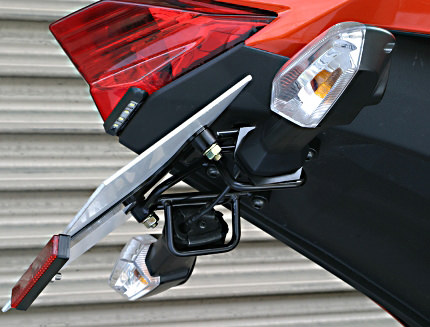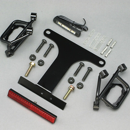※LEDナンバー灯を取り付けるにあたっては配線加工が必要です。リアフェンダーを取り外し、ナンバープレートとウインカーを移設するキットの発売です。ステー部はスチール製となります。ナンバーステーは、金属板の曲げ物が一般的ですが、カラーとシャフトを使用したトラス構造とすることによって、非常にレーシーなスタイルとなりました。キットにはLEDナンバー灯とスリムリフレクターも付属しており、より一層シンプルなリアビューとなっています。ナンバープレートの位置を変更しても純正のナンバー灯と純正のリフレクターではスタイルが台無しです。キットにはLEDナンバー灯とスリムリフレクターを使用することにより、より一層のシンプル&レーシーなスタイルを完全な形としております。ナンバープレートは共振してビビり音が出る場合がございます。その場合、防振ゴムを貼るなどの対応が必要です。
