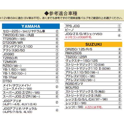 ワッテージ:12V30/30W(→50/50W相当)純正同等のハイワッテージ版純正比約1.6倍の明るさを純正並の消費電力で実現したバルブ。リレーやハーネス等もノーマルのままでOKなので、バルブ交換のみでライトチューンが可能。バイク専用設計で耐振・耐熱対策もバッチリ。口金の形状、ワッテージによって適合は異なります。12V車専用。※プラスチックレンズ車にも装着可能ですが、使用状況等によりレンズが溶ける場合があります。※12V車のみに適合(6V車は不可)。