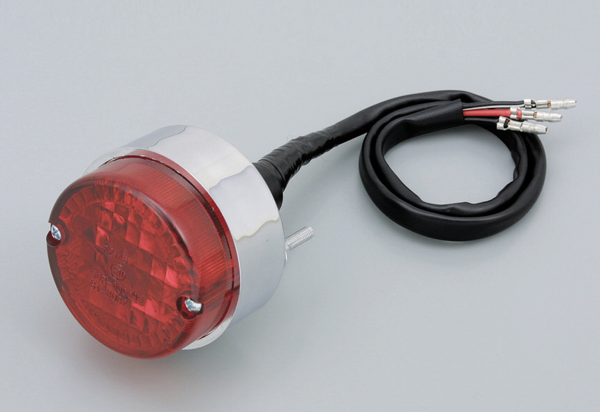 丸形の小型テールランプ。幅広いカスタムにマッチする形状です。汎用品につき、取り付けには加工が必要。取付ピッチ49mm。12V21/5WバルブB付属。レンズ径約56mm。(保安基準対応)別売りのリフレクターキット(20871/34496)との同時装着が必要。