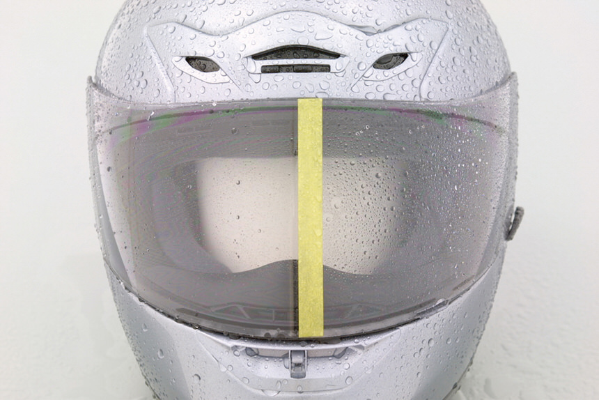 ヘルメットシールド・ゴーグル等樹脂素材用に開発されたはっ水コート剤。ヘルメットシールド・ゴーグルの外側にスプレーしてふき上げるだけで、雨天時走行50km/h程度(風洞実験より)で雨が吹き飛ばされて視界を確保します。また、同時に汚れや油膜の付着も防ぎます。ヘルメット専用傷・汚れ落し(62312)にて傷・汚れを落してから塗布すると完全定着し、より効果を発揮します。※ヘルメット専用シールド曇り止めと同じ面に併用することはできません。