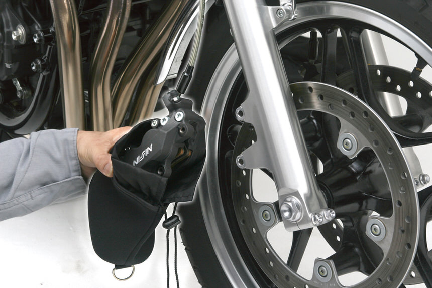 ブレーキフルードが漏れていたり、付着したままのキャリパーを入れた場合、ポーチ生地が変色する恐れがあります。
