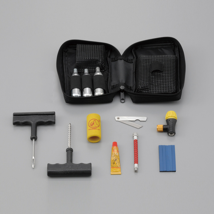 ツーリング先でのトラブルに備えて。持ち運びやすいコンパクトサイズ。●エアの補充までできます。※チューブレスタイヤ専用です。キット内容タイヤシール×5バルブジョイント×1ラバーセメント(10g)×1ジョイントホース×1工具(フック、リーマー)×1ボンベカバー×1カッター×1収納ケース×1エアボンベ×3