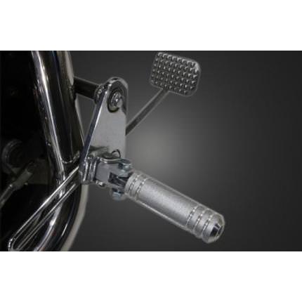 【製品の仕様】本体部分:メッキ仕上げ。黒い部分:ラバー製。ジョイント部分:アルミ製。フロントサイズ:最大外径約35mm。全長(ジョイント部分を含む)約151mm。リアサイズ:最大外径約35mm。全長(ジョイント部分を含む)約160mm。【製品の特徴】フットペグを交換するだけでだいぶイメージが変わります。