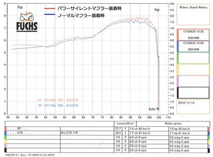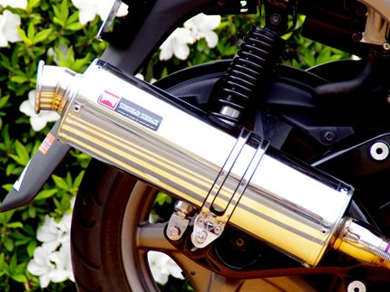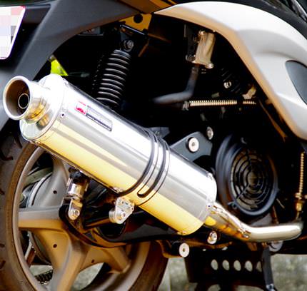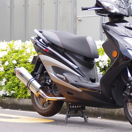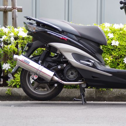 改造用としても、通勤用としても高い人気を誇るシグナスX、どこから加速しても、まったりと加速し、乗りやすいが逆に言えばパンチが無い。原付系の雑誌でも改造車両の筆頭に上げられ、スポーティーな走行がアピールされているのに、「俺のシグナスXは遅い」インターネットの口コミサイトなどを見ていると、そう感じているユーザーも多いようです。誤解を恐れずに言えば、シグナスXはノーマルでは遅いのです。シグナスXがなぜ遅く感じてしまうかというと、出足が遅い為です。ライバル車両のアドレスV125やPCXと比べても出足の遅さは顕著で信号待ちでのスタートダッシュでは必ずおいていかれてしまうのです。スポーツマフラーと言えば、排気を抜けやすくして、高回転時の加速を良くするのがセオリーです。しかし、シグナスXの場合は、前述したとおり、出足が遅い為、セオリー通りのマフラーは乗りにくいマフラーになってしまいます。そこでトータルのバランスを重視し、回転を落とさずに走るレース仕様マフラーではなくストップ&ゴーが多い街中で快適に走ることが出来るマフラーを目指しました。シグナスXには、AISという装置がついています。これは排気ガスの濃度を薄くし、新しい排気ガスの規制をクリアさせる為の装置です。シグナスX SE44J用 パワーサイレントマフラーは、AISシステムに対応させ、排気ガス濃度を薄くしています。更に白金コーティングを施したハニカム構造のメタル触媒をエキパイ内に配置しています。排気ガスの濃度を下げる為の装置ですが、エキパイに配置することで、適度に排気抵抗になり、低速時のパワーを得ることに成功しています。JMCAの加速時走行騒音試験において、近接排気音が 4250rpm/87dB 加速時騒音 74dBの評価を頂きました。ご自宅がマンションという方や住宅街の中にあるという方の場合、アイドリングの音や加速して出かけていく時の音が気になるという方もいらしゃると思います。シグナスXのノーマルのマフラーに比べると、音量は少し大きめですが、エンジンをかけて、自宅近くから大きめの道路に出るまで気を使わずに出て行くことが出来ます。