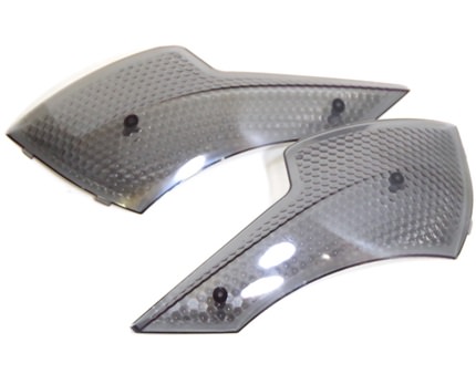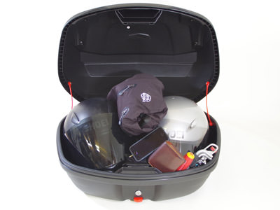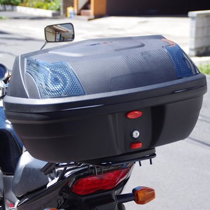 ※テールレンズは標準レッドカラーとスモークカラーを付属しております。踏んでも壊れないリアボックス フォーカラーズレンズリアボックスを発売してから大変ご好評を頂いている反面、様々な形でご意見を頂いてきました。その一つがワンタッチで簡単に開閉が出来るようにしてほしいという事でした。フォーカラーズレンズリアボックスの開閉はオートバイ用リアボックスではポピュラーなフラップ式を採用しています。構造がシンプルな為、多くのリアボックスに採用されていますが、開け閉めが面倒くさいという意見もあります。簡単に開閉が出来るワンタッチ式は、構造が複雑になってしまう為、コストがかかってしまう事と複雑な構造ゆえにリアボックス本体が大きく、重くなってしまうというデメリットがありました。また、ワンタッチ式は蓋を閉める際、どうしても蓋を押し付けて閉める為に車体及び、リアキャリアに負荷をかけてしまいます。メリットがある反面、デメリットも多いため、第一弾のリアボックスであるフォーカラーズレンズリアボックスではワンタッチ式の採用は見送っておりましたが、根強く開閉が楽なリアボックスが欲しいという意見がお客様から届いていた為、ワンタッチ式の鍵を採用したリアボックスを開発致しました。リアボックスのデザインは、丸みを帯びたデザインのものがほとんどです。しかし、車体によっては、丸みを帯びたデザインよりも、角のあるデザインの方が似合う場合もあります。角ばったデザインのリアボックスが欲しいというお客様の声を参考にして角を残したデザインにしました。また、蓋部分には流行のカーボンプリントを施し、便利グッズながらスポーティーなイメージを演出しています。エンブレムはツーカラーズレンズリアボックス エクスクルーシブ専用のデザインを採用しました。48リッターはメーカーやサイズにもよりますが、フルフェイスヘルメットが二個入る容量です。32リッターはよほど特別な形かサイズでない限り、フルフェイスは余裕で入ります。振動などでリアボックスがガタツキないようにベースには四箇所ゴムを埋め込んであります。このゴムが振動を吸収し、ガタツキをおさえています。ベース自体の素材は軽量な樹脂を採用しています。また、リアボックスのベースとキャリアを固定するナットは緩みにくいナイロンのセルフロックナットを付属しています。フチの部分を保護し、クッション性のあるトリムシール【ふちゴム】をリアボックスの淵に装着させています。雨やホコリなどの進入も防ぎます。別売りのインナーを装着すれば、中に入れる物の傷がつきにくくなります。