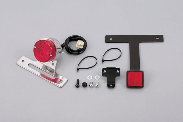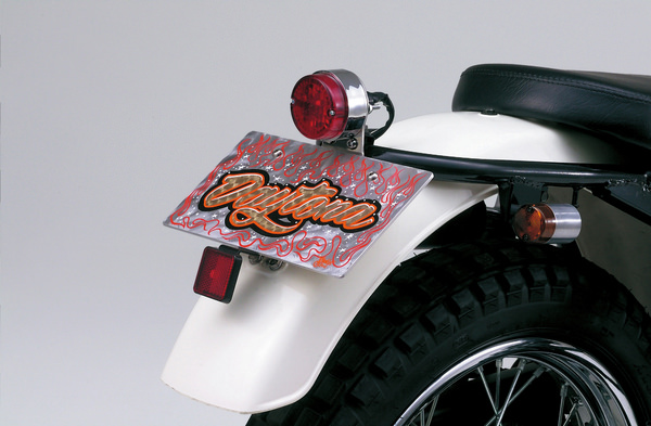 丸形の小型ムーニーテールランプ(41907)をすっきり取り付け。テールランプベースは純正リアフェンダーのR形状に合わせた専用品。車体への取り付けはラバーマウントで振動に強い。車検対応の型式認定リフレクターキット付属。ランプ補修部品はムーニーテール(41907)と同じ。※純正リアフェンダー、デイトナ社ステンレスフェンダー(42793テールランプなし)に取付可能。※型式認定リフレクターキット(オフセットタイプ43516)付属。