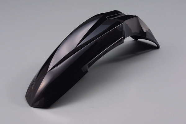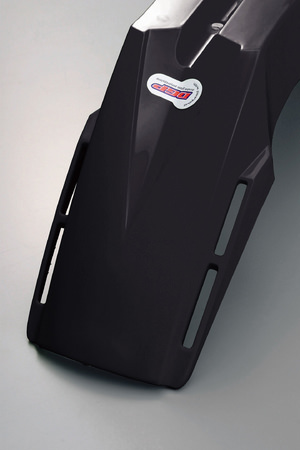 モタードテイスト溢れるエッジの効いたユーロフロントフェンダー。ユニバーサルタイプにつき、取り付けには穴開け加工が必要。
