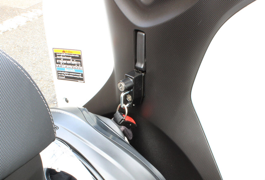 XLサイズやディフェーサー付ヘルメットなど、シート下に入らない方の為に。取付場所:純正荷掛フック下に設定したヘルメットロック。