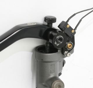 一般的なマスタースイッチは、レバー調節のたびに、工具を使用し固定ボルトを緩めることでスイッチ調整しなければなりませんでしたが、本製品は工具を使用せずにある程度の調整を簡単に行える新機構を搭載しています。ブレンボマスターシリンダー用スイッチキット付属のピボットピンにはゴールドカラーを採用。マスターシリンダーにワンポイントのアクセントを入れることにより、より高級感を演出します。シリンダー径:Φ19/Φ16