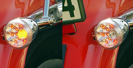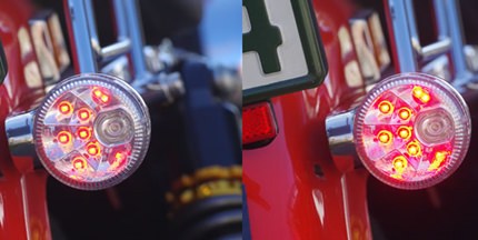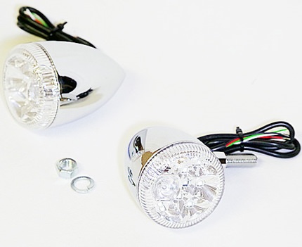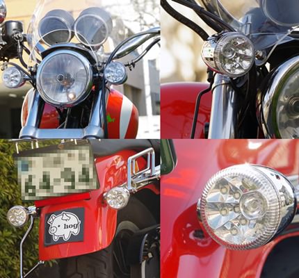 2個セットです。レンズ径:60Φ、横幅:102mm、奥行き:82mm、取り付けボルト径:10mm。スポーツスターに取り付けることを前提に開発致しましたが、汎用のLEDウインカーがベースですので、どんな車種にも取り付け可能です。ウインカーがテールライトの役目も果たしてくれるので、テールライトは不要になります。XL1200X フォーティーエイトのようなスタイルにしたいのであれば、フェンダーを切ってしまうのも手ですが、当社のデモ車には、カーボンシートで穴を埋めました。ウインカーボディに収まっていますが、ポジションランプ・ストップランプは両方点灯し。しっかりテールランプの役目を果たします。前後のデザインを揃えたいんですけど・・・という方の為に同デザインでウインカーの機能のみついている物も用意しました。ウインカー機能のみがついているフロント用に関しては、リア側と同じデザインですが、全てのLEDが黄色に点灯します。ノーマルのテールランプを使用して、ウインカーのみLED化したい方におすすめです。レンズはクリアレンズ仕様のみとなります。ライトオフの状態でも、メッキの反射板が美しく、ノーマルのウインカーとは一味違う見た目となります。配線:黒マイナス、赤ブレーキ、緑スモール、白ウインカー。LEDウインカーに交換される場合は、LEDウインカーに対応したリレーを使用するか抵抗などを使用してお取り付けください。(ウインカー点滅速度は1分間に60~120回になるように設定してください。)