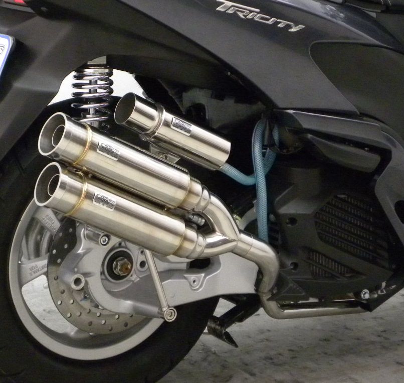 ■受注生産商品となっており、商品手配後 2週間程度入荷にお時間を頂きます。■※平成22年4月1日より施行された認証制度に適合する認証マフラーではありません。ご理解の程よろしくお願い致します。※画像中ブリーザーキャッチタンクは付属しません。2本出しタイプマフラーは発売以来大好評で、いまだ人気が衰えず絶好調です。アトミックツインマフラーは、ビックスクーター界で主流になりはじめたサイレンサーを短くした、最先端のドレンドマフラーです。極端に派手すぎずできるだけシンプルに自然なラインをイメージして制作しました。サイレンサーをできるだけ短くとり、車体のラインに調和させました。たくさんのお客様からの意見を取り入れて、あらゆるカスタムに似合うよう高級感が高く、かつシンプルなイメージでデザイン、製作いたしました。他社には無い時代を先行く2本出しマフラーが完成しました。バッフル(消音用パーツ)は、サイレンサー1本に対し1つずつ装備されていますので、簡単な作業で3種類の音量を選択できます。音質はとてもマイルドで重低音です。車体への固定方法は、画像では分かりにくいですがノーマルマフラーと同じ2点止めです。ローダウン車にも対応できるよう製作しています。ローダウン車でのテスト走行では問題ありませんでしたが、ショックの固さ、走行条件等で場合によりボディと干渉する恐れがあります。走行時にはリアショックを一番固い設定にして使用してください。【音量】バッフル両方装着時:排気音量 約 87dbバッフル片側装着時:排気音量 約 89dbバッフル非装着時:排気音量 約 91db