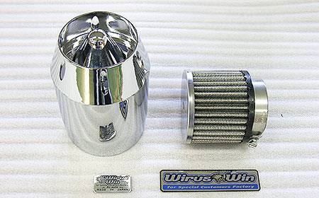 ■受注生産商品となっており、商品手配後 2週間程度入荷にお時間を頂きます。■還元パイプに対応しております。従来のエアークリーナーKitより、さらに低価格で手軽にパワーフィルター化できる今までに無いKitです。ボディはプラスチック製でクロムメッキを施しております。インテーク部分はステンレス製バフ仕上げで、取付ステーには強度の強い12mm径のステンレス丸棒を採用し、幾度ものテストを重ね完成させていますので、強度、耐久性はバッチリです。ノーマルエアークリーナーから、簡単にボルトオンで付け替えできます。ローダウン車両にも対応いたします。クリーナーにはパワーフィルターが装備されています。従来はパワーフィルターにあわせて、インジェクションコントローラーなどでのセッティングを行わなくてはいけませんでしたが、この商品は必要吸気量にあわせて一定の範囲内で無段階に調整でき、還元パイプ対応ということもあり簡単にセッティング出しやすく、パワーアップが計れます。ノーマルマフラー、ウイルズウィン製マフラーを付けた場合のエアーの量は、最小限から、15mm〜25mmのばした範囲で、ベストセッティングが捜し出せます。※ボアアップ、駆動系、抜けの良いマフラーに変更などの改造をされている場合は、インジェクションコントローラーなどでのセッティングが必要となることがあります。また、さらなるパワーアップを望む方にもインジェクションコントローラーなどでのセッティングは必要です。