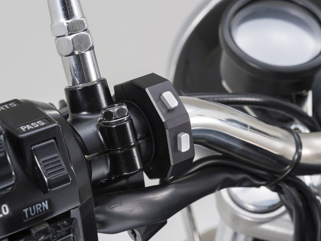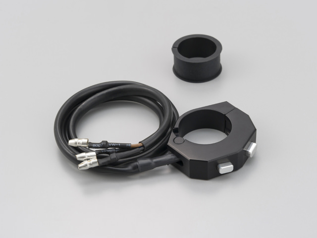 手元でコントロールビンテージスモールヘッドライトにデイトナ製VELONAシリーズのメーターを埋め込むと、ボタンが隠れてしまって操作ができなくなります。そんな時に役立つのが2ボタンスイッチです。汎用品ですのでアイディア次第で様々な使いかたができます。スイッチボディ幅12mm。※デイトナ社VELONAシリーズ電気式スピードメーターには、そのままご使用できます。※ギボシ端子は、CB104型になります。Φ22.2(7/8インチ)、Φ25.4(1インチ)ハンドルバー対応。本体:アルミ製ブラックアルマイト仕上げ。