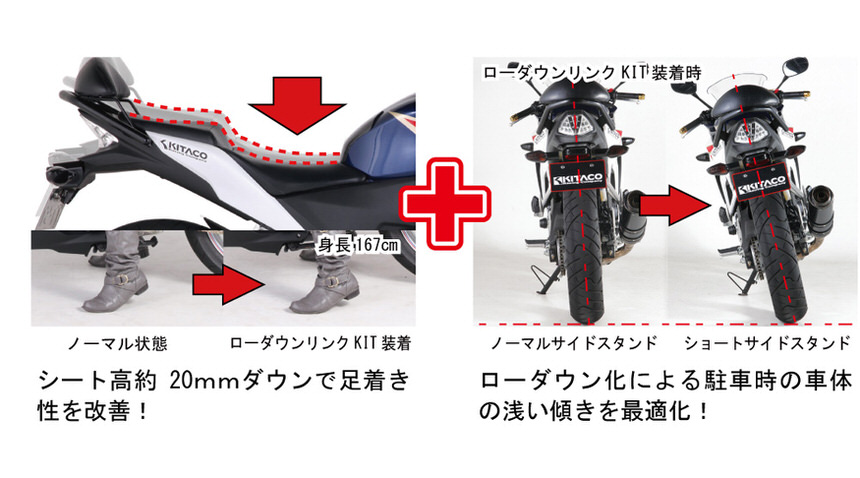 小柄な体型の方に最適なローダウンリンクキットとローダウン化に対応するショートサイドスタンドが1セットになったキットです。