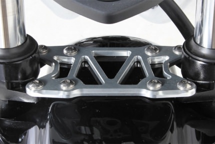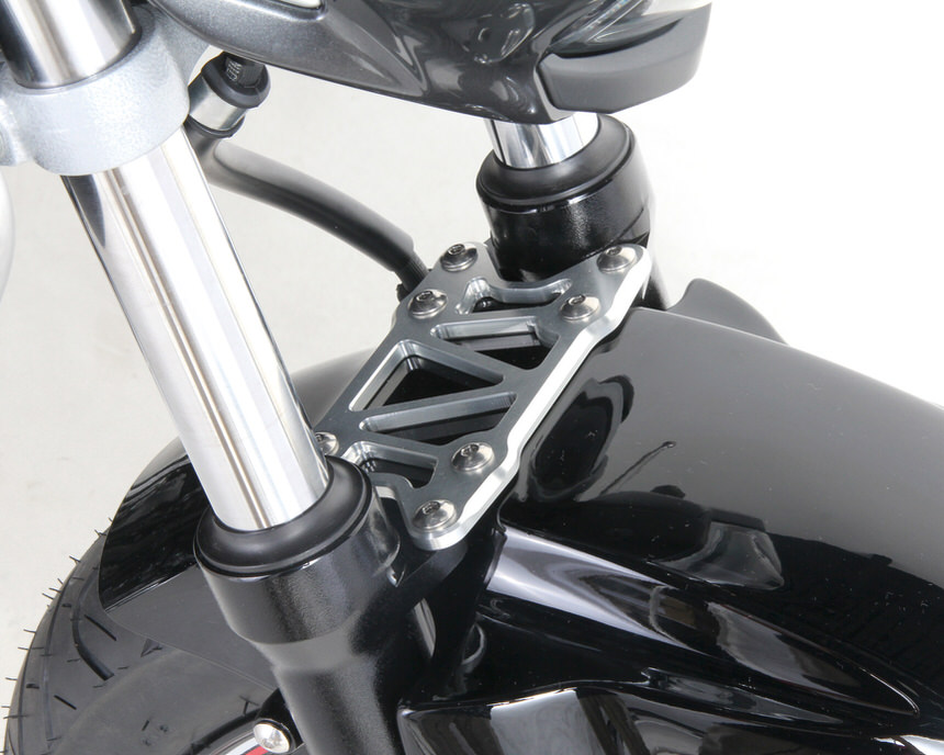 フロントフォークの剛性を向上させるスタビライザーです。スポーツ走行時にしっかりしたフロント周りの安定性が得られます。アルミ削り出しシルバーアルマイト仕上げノーマルフェンダー、キタコ社製フェンダー取付可