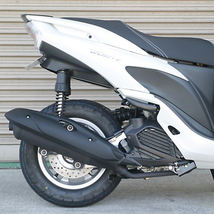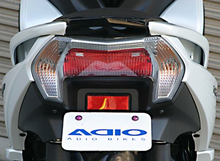 ※純正のリアフェンダーをカット、穴開け加工する必要があります。大型のリアフェンダーを途中でカットし、ナンバープレートをテールランプ側へと近づけるアディオのフェンダーレスキット。近未来的なトリシティに合わせて、シンプルに無駄のないデザインとしました。テールランプ、ウインカー、リフレクターと、ナンバープレートの一体感が特徴のスッキリリアビューの完成です。純正大型リアフェンダーをカットし、ナンバープレートの位置を上側に移動。テールランプ、ウインカー、リフレクターと、ナンバープレートのバランスを最適にレイアウトし、テール周りの一体感を実現したフェンダーレスキットです。シンプルでスマートなリアビューをお手軽に実現しています。純正のリアフェンダーをカットし、穴あけ加工を施すだけで、取り付けできます。リフレクターもナンバー灯も純正のまま。ナンバープレートの位置を変更するだけです。ナンバーステーと、ボルト、ナットだけのキット構成とし、コストパフォーマンスにも優れています。シンプル構成、シンプルスタイリング!!ナンバープレートが共振してビビリ音がでる場合があります。その場合は、防振ゴムを貼るなどの対応が必要です。