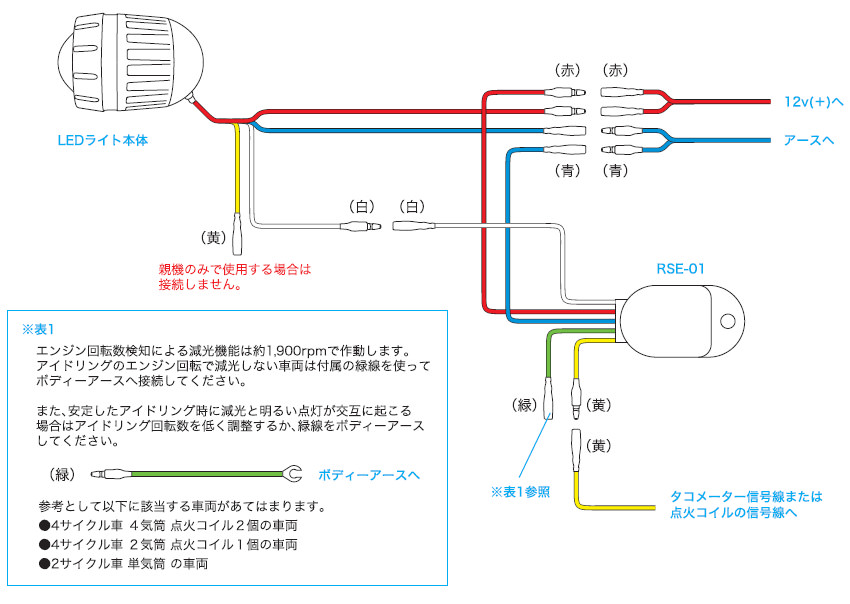 HIDを超えた明るさと更に省電力入力電力は28W、色温度は6000Kとなっております。明るさの目安としては、35W 6000KのHIDと比較して同等以上の明るさがあります。照射イメージいきなり明るい素早い点灯!HIDと違い電源投入直後からフルパワー点灯します。またHIDのように徐々に発光色が変化する事がありません。バッテリーに優しい自動減光システム採用!ディマーセンサー(自動調光システム)を搭載、REVセンサー(エンジン回転センサー RSE-01)を採用しております。日中周囲の明るさに反応してLEDの発光量を自動で減光しますので、日中はデイライトとして機能し、夜間は28Wフルパワーで点灯します。(減光状態との差は5倍です。)また、REVセンサー(エンジン回転センサー RSE-01)を接続する事で、停車中アイドリング時にも減光しLEDの発熱を抑え、バッテリーへの負担も軽減します。走行風による強制空冷タイプ本製品は、走行風を本体ユニット全体に当てる事でLEDの発熱を強制的に冷やす設計となっております。例として時速36kmで風速10mの風で冷却されるため走行中はほとんど発熱しません。停車中はREVセンサー(エンジン回転センサー)の働きで1/5減光しますのでほとんど発熱はしません。子機の増設が可能!別売の子機(REVセンサー無し)を接続する事で車体の左右に振り分けての取付けが可能です。質感の高いダイキャストボディ本体は高級感あふれるダイキャスト製です。選べる4種類の方向性の取り付けボルトディマーセンサーと配線の向く方向性に指定がある本製品は、車両ごとの様々な取り付けシチュエーションに対応するために、4種類の取り付けボルトの方向性のバリエーションを設定しました。取付け時の注意事項取付けについては保安基準を満たすため、以下の条件のもと取付けてください。・ヘッドライトの中心より下に装着する事。・照射はヘッドライトの光軸より下である事。・フォグライトだけで同時に3個以上点灯してはいけない。・独立した点灯、消灯できるスイッチを取り付ける事。・取り付け位置は地面から25cm以上80cm以下である事。DC12V 28W 6000K