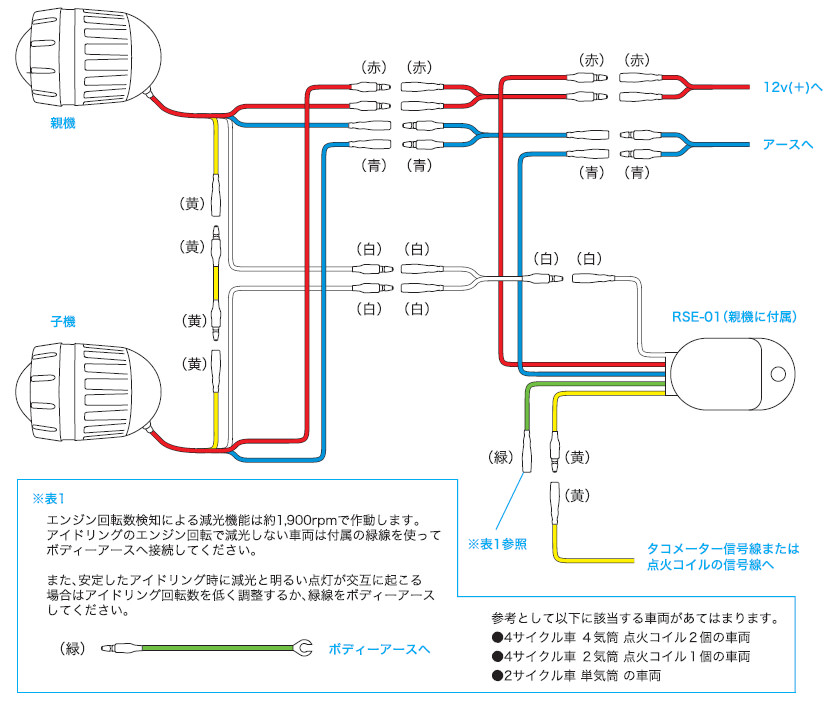 HIDを超えた明るさと更に省電力入力電力は28W、色温度は6000Kとなっております。明るさの目安としては、35W 6000KのHIDと比較して同等以上の明るさがあります。照射イメージいきなり明るい素早い点灯!HIDと違い電源投入直後からフルパワー点灯します。またHIDのように徐々に発光色が変化する事がありません。バッテリーに優しい自動減光システム採用!ディマーセンサー(自動調光システム)を搭載日中周囲の明るさに反応してLEDの発光量を自動で減光しますので、日中はデイライトとして機能し、夜間は28Wフルパワーで点灯します。(減光状態との差は5倍です。)走行風による強制空冷タイプ本製品は、走行風を本体ユニット全体に当てる事でLEDの発熱を強制的に冷やす設計となっております。例として時速36kmで風速10mの風で冷却されるため走行中はほとんど発熱しません。子機の増設が可能!別売の子機(REVセンサー無し)を接続する事で車体の左右に振り分けての取付けが可能です。質感の高いダイキャストボディ本体は高級感あふれるダイキャスト製です。選べる4種類の方向性の取り付けボルトディマーセンサーと配線の向く方向性に指定がある本製品は、車両ごとの様々な取り付けシチュエーションに対応するために、4種類の取り付けボルトの方向性のバリエーションを設定しました。取付け時の注意事項取付けについては保安基準を満たすため、以下の条件のもと取付けてください。・ヘッドライトの中心より下に装着する事。・照射はヘッドライトの光軸より下である事。・フォグライトだけで同時に3個以上点灯してはいけない。・独立した点灯、消灯できるスイッチを取り付ける事。・取り付け位置は地面から25cm以上80cm以下である事。DC12V 28W 6000K