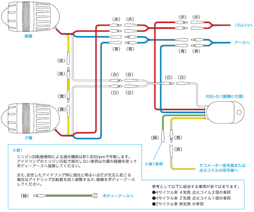 別売の子機(REVセンサー無し)を接続する事で車体の左右に振り分けての取付けが可能です。
