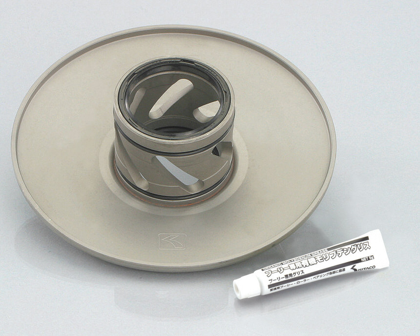 トルクカムの動作はクラッチセンタースプリングの力とドライブベルトの駆動に反発して、ベルトの回転方向とは逆方向に、ねじられながら広がって行きます。ベルトの摩擦力の大きい方(ねじれ角度の大きい方)が低速域から高速域までの変速動作が遅くなります。逆に高速域から低速域までの変速動作は速くなる特性となります。スーパートルクカムはねじれ角度の大きさやスリット形状を変える事により、車両のチューニング度合いに応じた変速特性を選べます。スリット形状3種類(溝タイプA/B/C)プーリーグリス付属