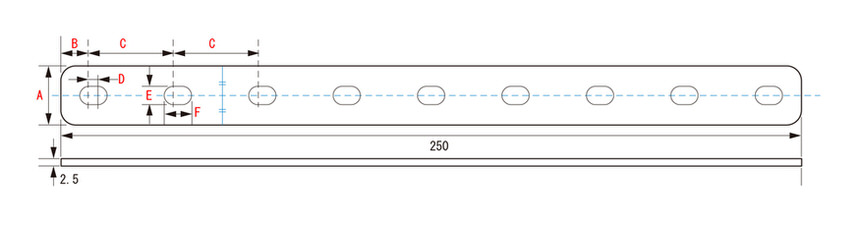 厚さ:2.5mm・全長:250・全幅A:25・幅B:14・幅C:43・幅D:7・長穴サイズ E×F:10.2×17.2・長穴数:6