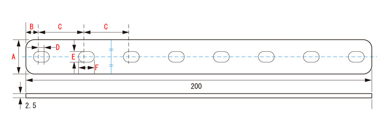 厚さ:2.5mm・全長:200・全幅A:25・幅B:13.5・幅C:41.5・幅D:7・長穴サイズ E×F:10.2×17.2・長穴数:5
