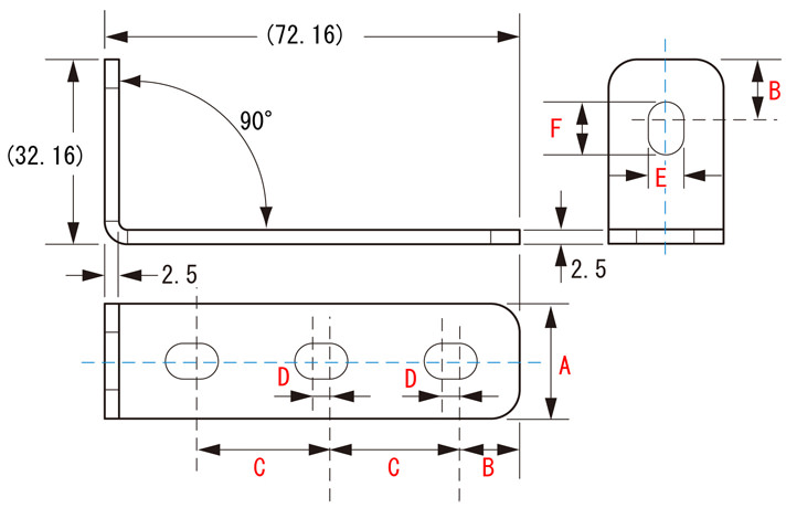 厚さ:2.5mm・全幅A:20・幅B:10.5・幅C:22.5・幅D:3・長穴サイズ E×F:6.2×9.2・長穴数:4