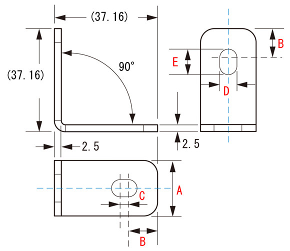 厚さ:2.5mm・全幅A:20・幅B:10.5・幅C:3・長穴サイズ D×E:6.2×9.2・長穴数:2