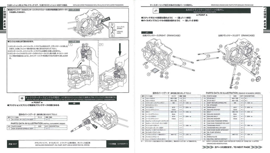 モンキー・スーパーカブ系横型エンジン(腰下)をイラスト図解で分かりやすく初心者の方も対象に組み付け方を解説しています。※14年10月現在のキタコ商品ラインナップを中心に掲載しています。過去に販売していた商品や14年10月以降に販売する商品は該当しない場合があります。※虎の巻(腰上編)Vol.4はVol.25に掲載しています。
