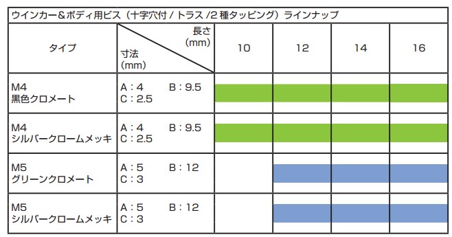 K・CON クリップナットのビスとしても使用可能。M4 →ホンダタイプ /M4/ タッピング用 0900-059-00004(3 ヶ入) 300(税抜)M5 →ヤマハタイプ /M5/ タッピング用 0900-059-00005(3 ヶ入) 300(税抜)ホンダタイプ /M5/ タッピング用 0900-059-00015(3 ヶ入) 300(税抜)