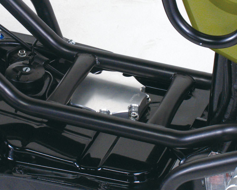 ズーマー用サブフレーム装着時に露出してしまうフュエルポンプをカバーするドレスアップパーツです。アルミ削り出しシルバーアルマイト仕上げ