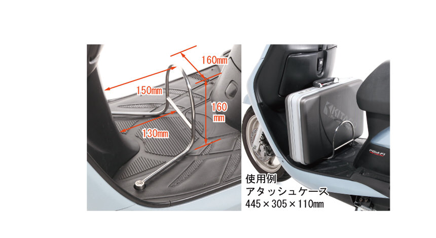 鞄やアタッシュケースの置き場に重宝するフロアキャリアです。ステンレス製パイプサイズ:φ8※フュエルリッドを全開にすると、キャリアと干渉します。開く際には十分ご注意下さい。※荷物を置く際は走行中落ちないように、市販のゴムバンド等を使用して固定して下さい。