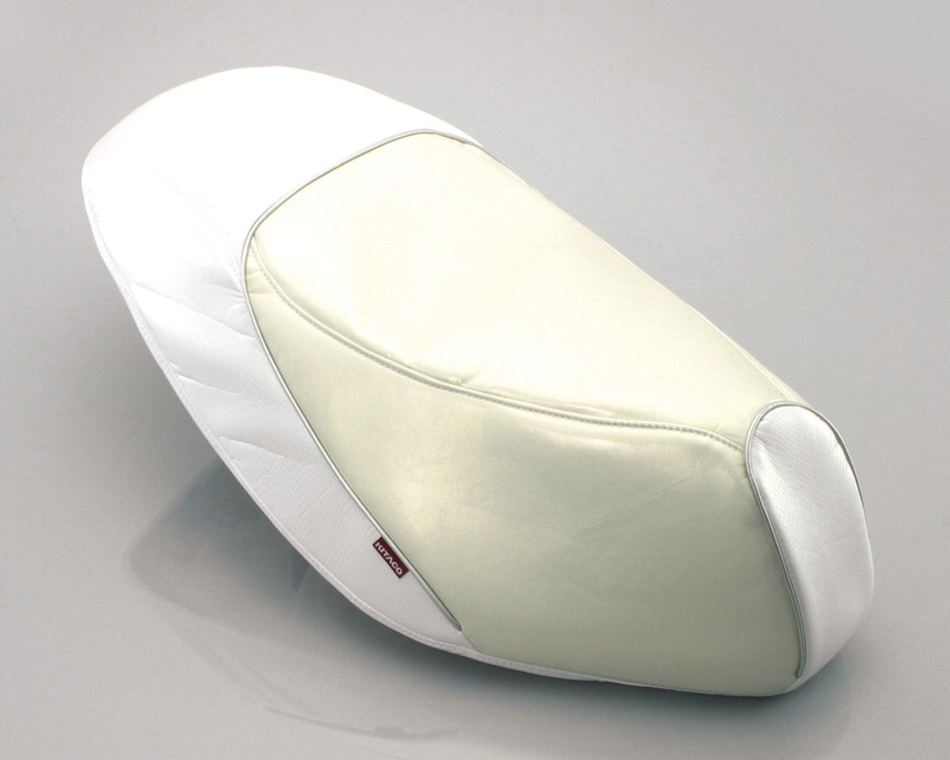 PVCレザーを使用。エナメルの艶やスネーク柄の生地を配し、パイピングの色にもこだわった高級感のあるシートカバーです。ホワイトとブラックの2色を設定。シート形状に合わせた専用設計。シートに被せるだけの簡単装着。PVCレザー座面:エナメル調サイド:スネーク柄※CF4MAモデルは使用不可