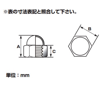 入数:1仕様:10mm用ピッチP1.25 A14.2 B14 C8危険防止や美観の向上を目的として、ネジ部が突き出さないよう袋状になっているナット。10mm用/小形は2面幅が一般のナットに比べて小さいタイプです。