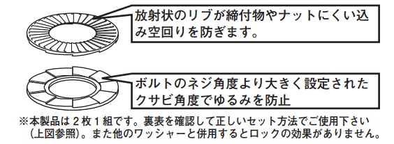 ※入数:1スウェーデン「ノルトロック」社製品振動によるゆるみを防止。潤滑油に影響されない締め付け力。スチールとステンレスの 2 種類をラインナップ。再使用可※再使用時には潤滑油を塗布してご使用下さい。※ 300℃以上または、-20℃以下でご使用後の再使用不可。※逆ネジでの使用不可。※実際の商品とは色合いが異なる場合があります。ご了承下さい。