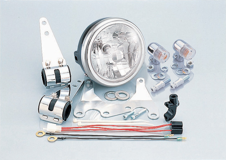 レーサーレプリカをネイキッド仕様にする為に必要なパーツを全てそろえたKITです。Φ130マルチリフレクターヘッドライト仕様PH-7 12V30/30Wホワイトブルー球付属12V15Wアンバー(G18口金球)球付属