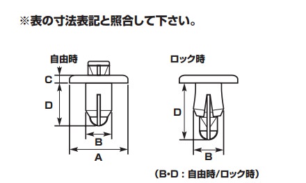 ※入数:3パネル等を取り付けられる樹脂リベット。脚部が押し広げられ構成パネルを固定します。再使用可能ヤマハタイプΦ6はホンダタイプΦ6としても使用可能。適合板厚:3.0 ~ 5.0mmA:12・B:5.9/7.5・C:1.5・D:13/19(mm)