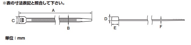 ※入数:5カーボンブラックを添加し、紫外線特性を向上させた屋外使用の結束バンド。使用温度範囲:-40~85度耐候タイプA:202・B:4.6・C:7.6・D:5.9・E:7.3・F:1.2(mm)最小/最大結束径:Φ1.5/Φ50