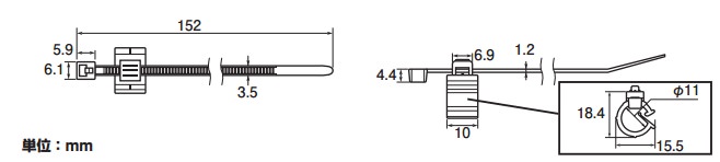 ※入数:2二系統のケーブルの結束と固定に。 タイ部でケーブルを固定し、クリップ部は取り付けたケーブル(最大5mm径)を自由に動かすことが可能。使用温度範囲:-40~110度耐熱・耐候タイプ152×3.5mm
