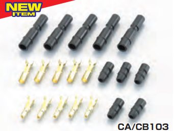 防水スリーブが付属したギボシ端子セット。黄銅製スズメッキ(CA/CB103 は生地+防錆処理)適合電線:AVまたはAVS0.5~1.25※ 103 と 104 は太さが異なります。(オス端子サイズ 103:Φ3.5 104:Φ3.96)【SET内容】オス/メスギボシ×各5 オス/メススリーブ×各5