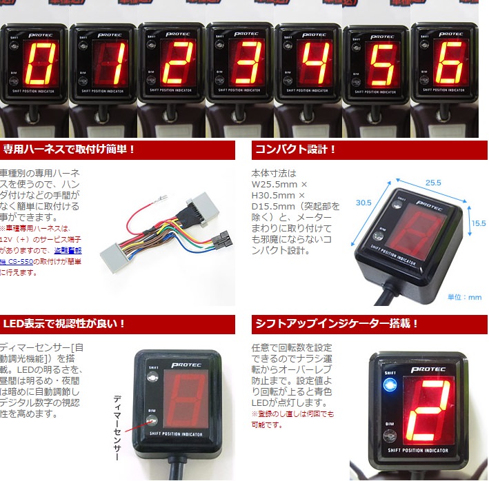 車種別の専用ハーネスを使うので、ハンダ付けなどの手間がなく簡単に取付ける事ができます。※車種専用ハーネスは、12V(+)のサービス端子がありますので、盗難警報機 CS-550の取付けが簡単に行えます。本体寸法はW25.5mm × H30.5mm × D15.5mm(突起部を除く)と、メーターまわりに取り付けても邪魔にならないコンパクト設計。ディマーセンサー[自動調光機能])を搭載。LEDの明るさを、昼間は明るめ・夜間は暗めに自動調節しデジタル数字の視認性を高めます。任意で回転数を設定できるのでナラシ運転からオーバーレブ防止まで。設定値より回転が上ると青色LEDが点灯します。※登録のし直しは何回でも可能です。