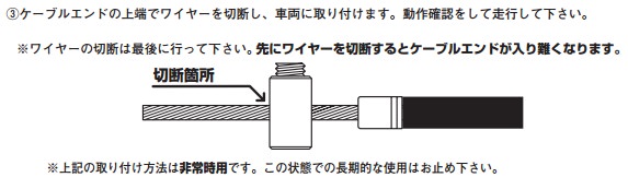 ※入数:1ツーリング先等での突然のワイヤートラブルに対応出来る応急用ワイヤー SET。ハンダ固定に適したスチールワイヤー採用により、ハンダ固定での長期的な使用も可能となります。 SET 内容スチール/亜鉛メッキインナーワイヤー(Φ1.5×2m 片側ケーブルエンドハンダ固定済)× 1ケーブルエンド(6×6/スロットルパイプ側)×1 L 型レンチ、ホーローネジ(イモネジ)付属
