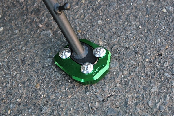 高強度アルミニウム合金素材(A6061-T6処理済み)で、精密加工された本体にアルマイト処理を行うことにより高級感・高精度を実現。接地面積を増大させ、より安定した状態でバイクを停車する事が出来ます。底部溝ありの排水設計により、雨天時でもスリップする確率を低減させることができます。