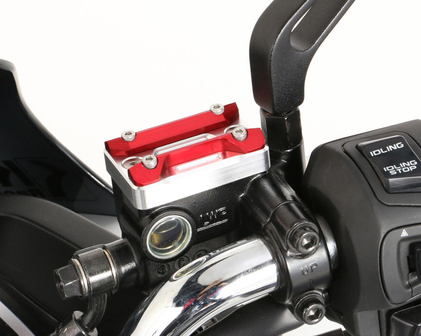 マスターシリンダーキャップに2ピースのアルミ削り出しがラインナップ。ハンドル廻りの空間を有効活用。アルミ削り出し製アルマイト仕上げ2ピースタイプTYPE2はドレスアップの2ピースタイプのマスターシリンダーキャップです。マスターシリンダーキャップ/ステー装着について本製品はマスターシリンダー上に計器類を設置するなど、純正品とサイズ(厚み)が異なる為、車種によってはハンドル操作時にスクリーンなど他のパーツに接触し装着できない場合がございます。特にタイプ3はマスターシリンダー上に計器類等を装着して使用するため、ハンドル操作の妨げとなる荷重がかかる物は装着しないで下さい、製品の破損や走行中思わぬ事故を起こす原因となりますのでご注意下さい。(耐荷重量:250g)※ホンダスクーターのABS 車は使用不可