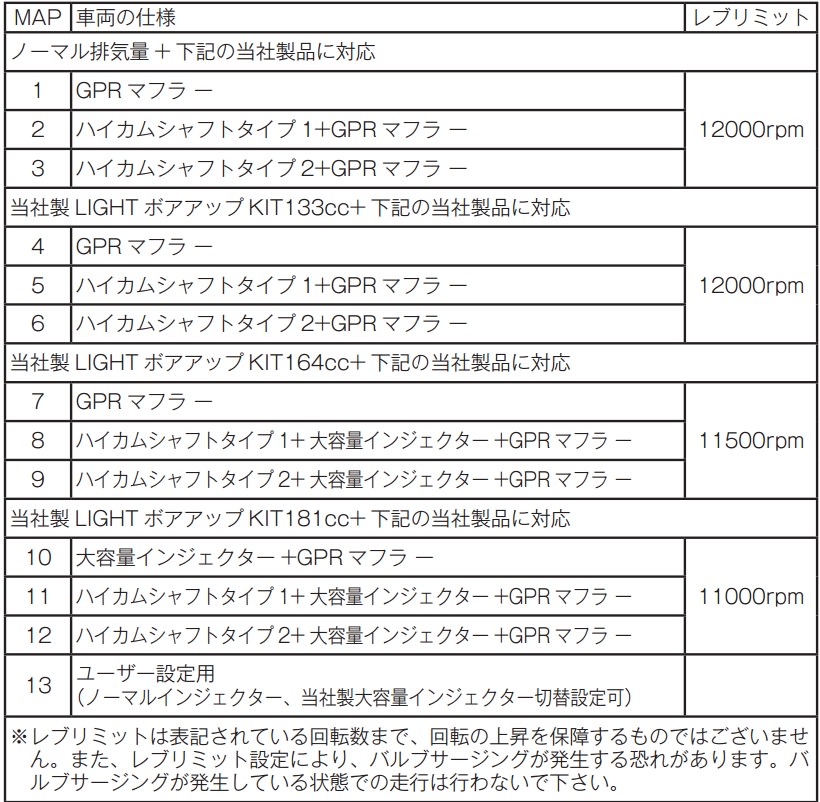 燃料噴射量を補正するFIコントローラーです。キタコ製パーツの組み合わせに対応する複数の最適マップをインストール済みで、ユーザーはI-MAPを取り付けた後、スイッチの設定でマップを選択します。(マップ数は車種により異なります。)また、キタコ製以外のパーツの装着やユーザーの好みに対応させるため、ユーザーオリジナルマップの作成も可能です。オリジナルマップの作成は別途PCインターフェイスケーブル(763-0500900)とwindows搭載のパソコンが必要です。※装着には配線加工が必要です。