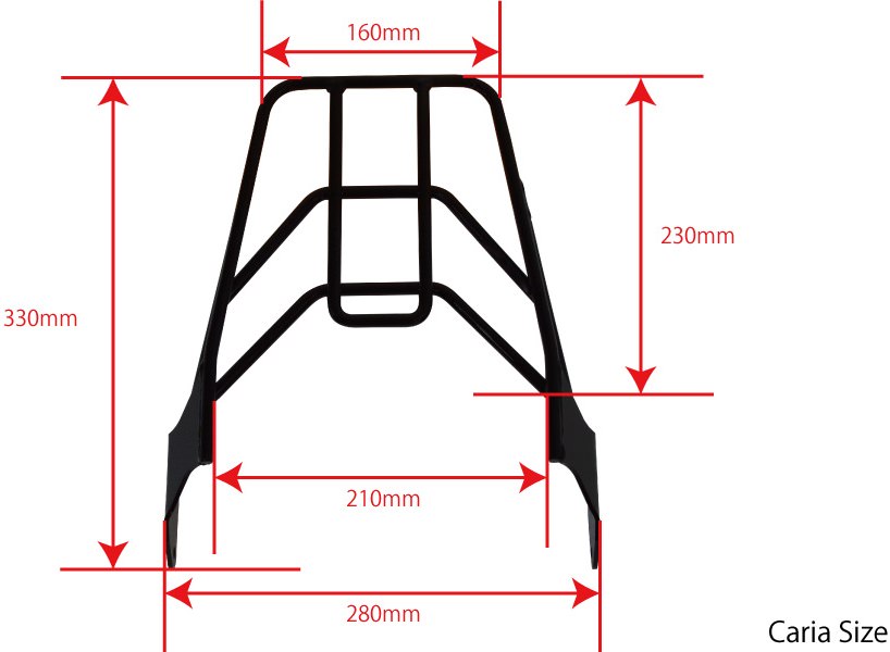 ※CB1300SBにはグラブバー位置干渉のため取付未確認。このリアキャリアのデザインコンセプトはCB1300と共通の「キレ」とし、CB1300SFやCB750のデザインを崩さないリアキャリアのデザインを採用しました。各部のパイプは直系9mmのパイプを使用し、取り付け部分の鉄板は3mmの板を使用しました。これらの部材を採用したことによってリアキャリアにボリュームを持たせすぎないデザインにする事が出来ました。パイプ部分は基本的に直線で構成しましたが、取り付け板部分にはCB1300やCB750のデザインに採用されている流れるような流線型デザインを一部採用しています。CB1300SFもCB750もグラブバーを取り外さないでリアキャリアを装着する方法を選択した為、グラブバーとリアキャリアの間を広めに取り、パッセンジャーがグラブバーをつかめるデザインを採用しました。※グローブが厚めの場合はグラブバーがつかめない可能性はございます。本体サイズ:最大幅:280mm、最小幅:160mm、全長:330mm、荷物部長さ:230mm。CB1300SF CB750用マルチリアキャリアの天板はリアボックスのベースを固定する波型プレートを二箇所固定で装着しやすい設計にしており、ほとんどのメーカーのリアボックスは装着可能です。リアボックスのベースを取り付けする時に取り付け方は各メーカーごとに若干は異なりますが、基本的にはリアキャリアにリアボックスを装着する為のベースを装着します。ベースを装着する際には波型のプレートを使用しますが、キャリア本体のデザインによっては、波型のプレートを二箇所で固定するのが難しい場合があります。その場合は、一箇所固定でも問題ありませんが、やはりしっかりと二箇所固定したほうが安心です。CB1300SF、CB750のどちらの車両もタンデムグリップがシートよりも高い位置にある為、リアキャリアをグリップよりも少し高い位置に配置することで、シート、グリップ、リアキャリア三点のパーツで大きな荷物を積む事が可能にしています。また、各部の負荷を分散させる事にもなる為、より重い荷物を積載する事が可能です。