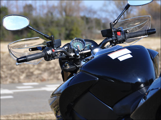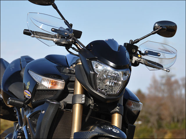 走行風よりライダーの拳や指先を保護するナックルガード。シールド本体はポリカーボネイト製。十分な強度をもたせた取付けステーは高い風圧を受けてもガタツキが出ないように考慮された形状を持ち、左右のミラーに共締めするだけのボルトオン設計です。カラー:クリア