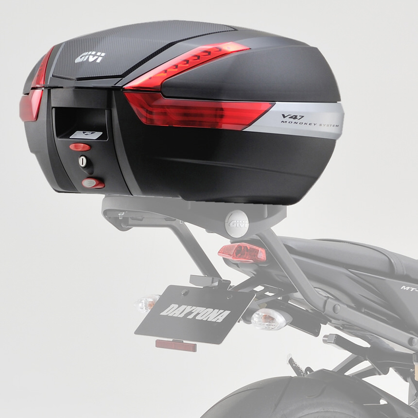 上蓋中央のアルミパネル部をカーボン調の樹脂パネルとし、スパルタンなイメージを強調させたモデル。プッシュダウンクローズシステム、セキュリティキー標準装備。奥行450mm×幅590mm×高さ320mm本体重量 約4.4kg 最大積載量10kg。操縦性を考慮してデイトナでは3kg以下での走行仕様を推奨。※ベース付属なし。車種別専用フィッティングおよび指定モノキーベースが別途必要です。※フィッティングの積載制限重量を超える状態での走行使用は厳禁です。※防水性を考慮した設計ですが、完全防水ではありません。未塗装ブラック(カーボン調パネル)