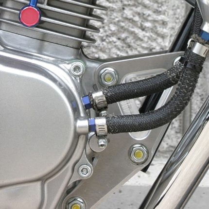 ボアアップをはじめとして、ハイチューンされたエンジンの必需品。高回転・高性能化したエンジンはその代償として膨大な熱を発し、ノーマルのままでは、オーバーヒート・焼き付き等、破損する場合がありますので、オイルクーラーの装着をお薦めします。スーパーオイルクーラーKITは400ccクラスのオイルクーラーと同等の放熱量(5段コア)を誇り、レースを始め炎天下等の苛酷な条件下でも、安定したエンジン性能を発揮します。車種専用ステー付属。ボルトオン装着が可能です。(注:タンクやクラッチ等、その付近のアクセサリーパーツ等を同時装着している場合は取付ステーの変更または加工が必要な場合があります。)オイルクーラーにはホース取り回し自由度が高いユニオンボルトを採用。またユニオンボルトには、カラーアルマイト処理済み。コンデンサー内オイル容量 150cc(5段コア) 75cc(3段コア)コンデンサーは必ず取付説明書の通りに装着して下さい。ユニオンニップル側を下向けに装着すると、油圧が低下しシリンダーヘッドの潤滑不足につながります。ホースには内径φ6.2、外径φ12.6の外層ブレードホースを採用。高耐圧と高耐久性を誇ります。※要右側ケースカバー加工オイルラインの取出しは右側クランクケースカバーです。3段コアコンデンサー※ノーマルマフラー使用不可。その他アップタイプマフラーではオイルホースと干渉する場合があります。※大容量オイルポンプとの併用をお薦めします。【セット内容】ニップル(A)ロング ×1ニップル(B)ショート ×1オイルクーラーコンデンサー(3 段) ×1ユニオンボルト(レッド) ×2ユニオンニップル(ブルー) ×2アルミバンジョーボルト/ワッシャー ×4ステンレスバンドNO,12(φ8-12) ×4オイルクーラーホース100cm ×1コンデンサーステー ×1グロメット(7.5×9×7.5) ×2グロメットカラー(6.2×7.5×7) ×2M6×18 キャップボルト ×2ワッシャー(6.5×16×1.6) ×4コの字ボルト M6×35×47L ×1平ワッシャー 6mm ×2スプリングワッシャー 6mm ×2ナット M6×2